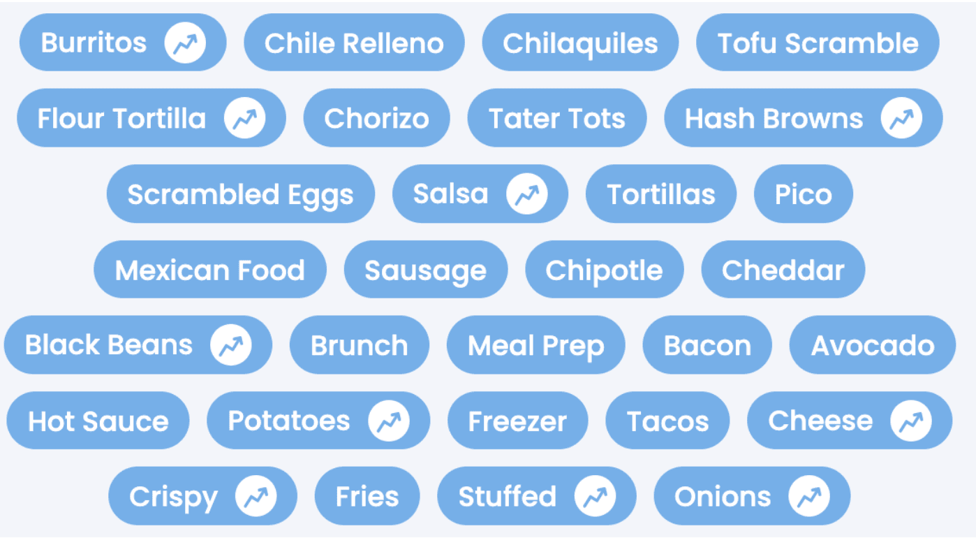 The main terms and concepts associated with conversations that mention “breakfast burritos”