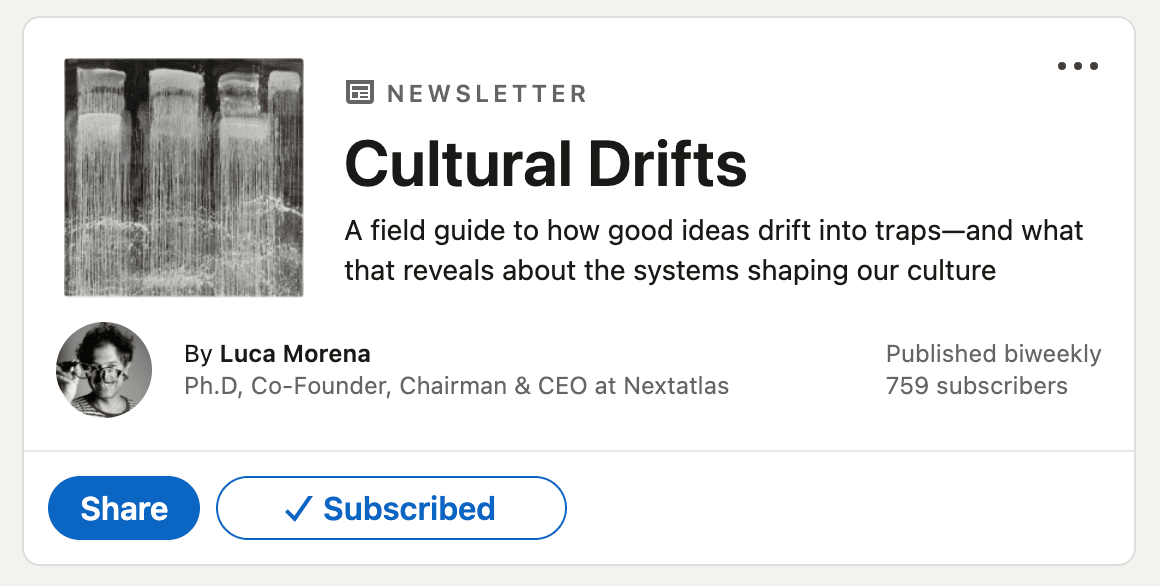 Luca’s newsletter, Cultural Drifts, is described as “a field guide to how good ideas drift into traps, and what that reveals about the systems shaping our culture.”