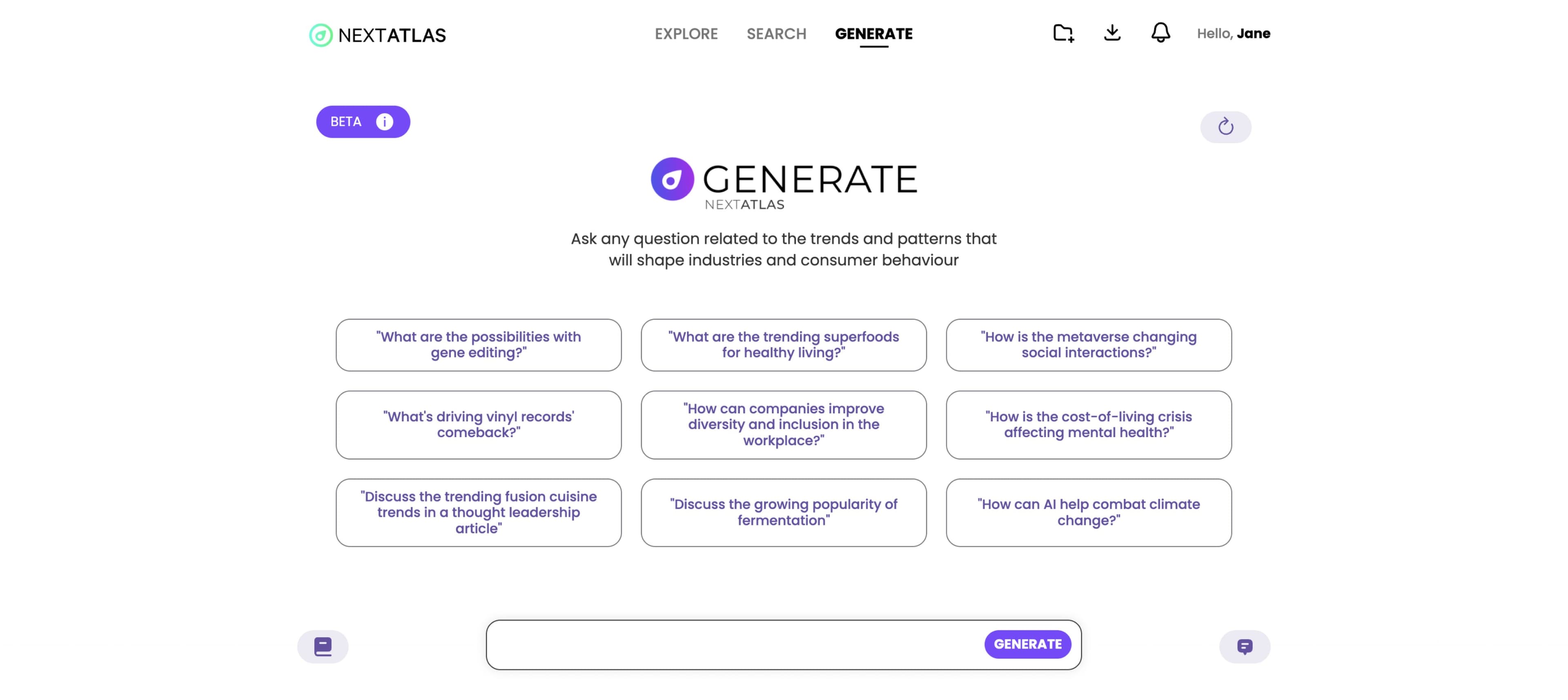 As insight professionals navigate faster consumer cycles, fragmented data environments, and constant cultural flux, having AI agents that are intelligent, explainable, and proactive will become the norm. At Nextatlas, we foresaw this shift and we built Generate Suite, not as an experiment, but the next step in collaborative insight generation, where humans ask smarter questions, and AI agents help uncover answers that matter.