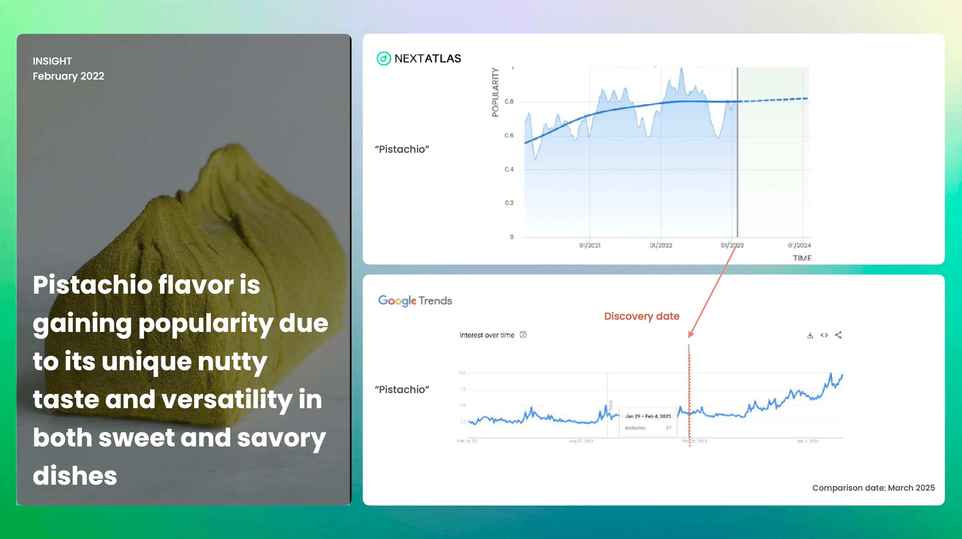 Our platform identified pistachio as a rising flavor trend in early 2022. Google searches started climbing shortly after, confirming growing consumer interest and validating our early signal detection