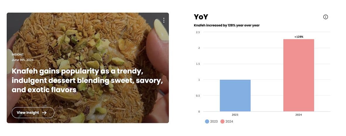 We first identified noise around Knafeh in June 2024 in our early adopter conversations. In January 2025, we discovered that mentions of knafeh had increased by 128% YoY (screenshots taken from the Nextatlas platform in April 2025)