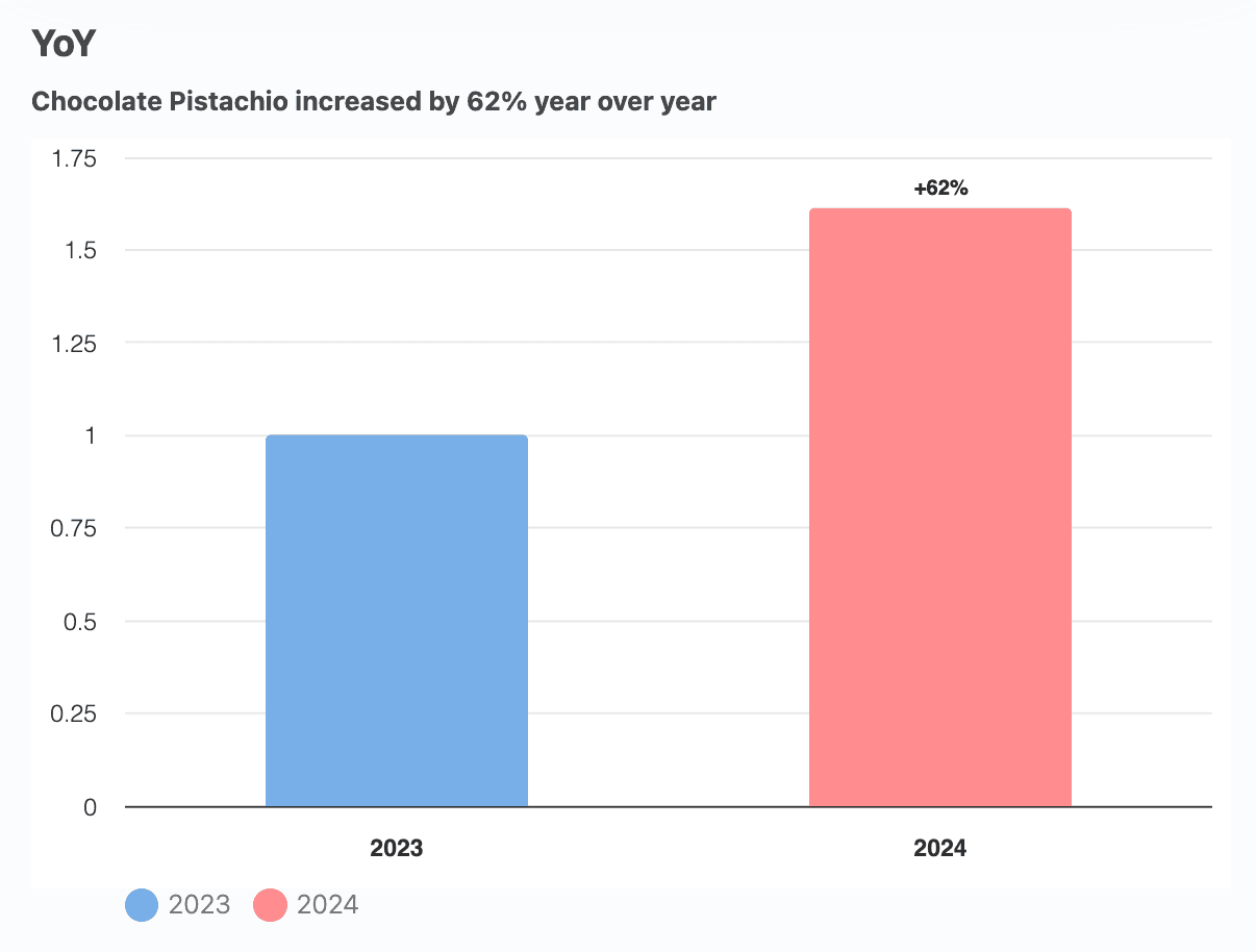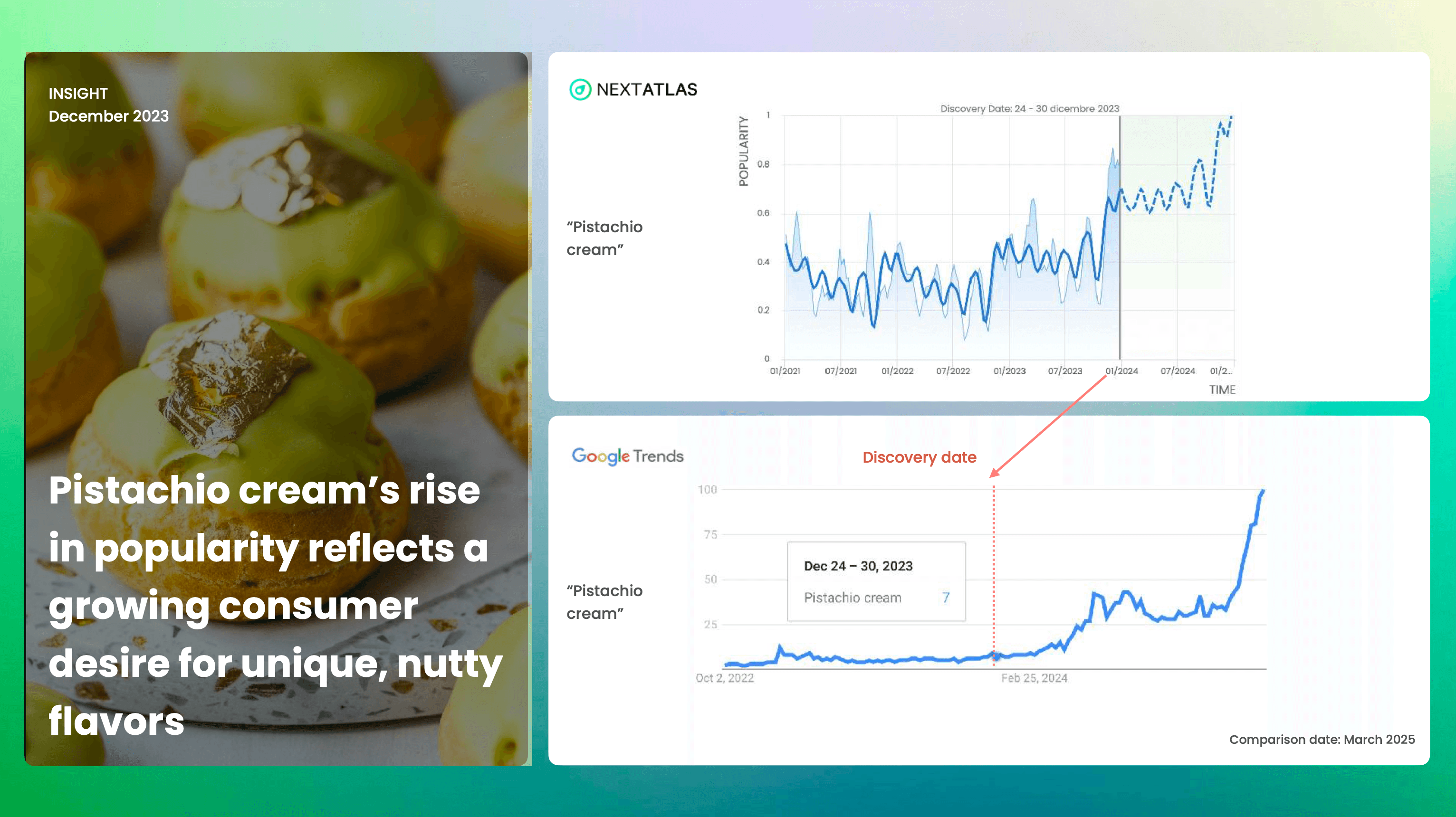 We spotted pistachio cream gaining momentum in December 2023—well ahead of the sustained public interest we see now