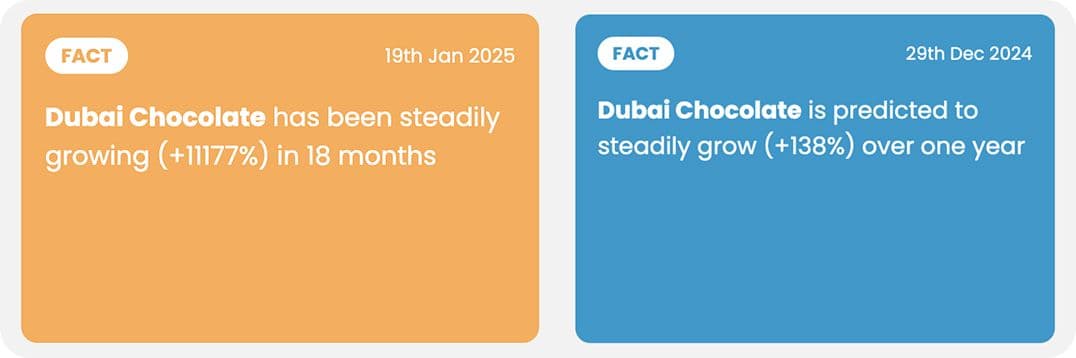 In September 2024, a confectionery phenomenon emerged from the UAE and quickly swept the globe. The Dubai chocolate—a luxurious fusion of pistachio cream, knafeh, and premium chocolate—captured everyone's imagination (and appetite). With an astronomical growth rate of 11,177% over 18 months in our early adopter conversations, it wasn’t just a flash-in-the-pan fad; it was a full-on cultural moment.