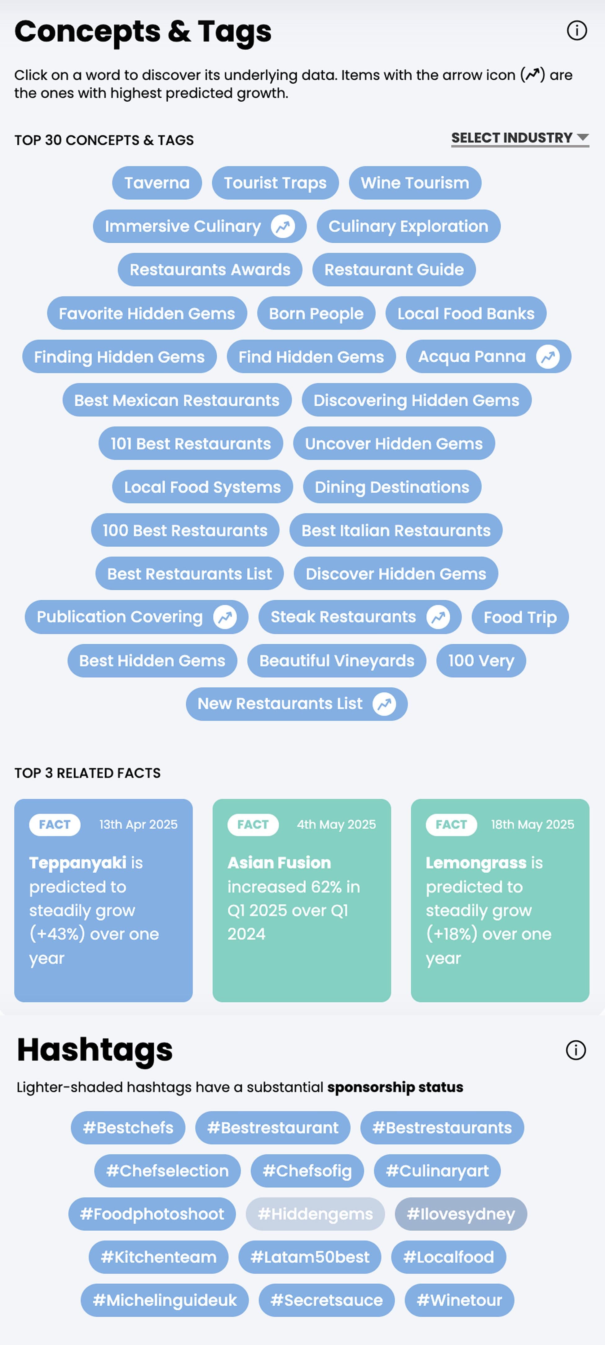 Top concepts, tags and hashtags from the "Pilgrims of Taste" trend on the Nextatlas platform (screenshot taken in June 2025)