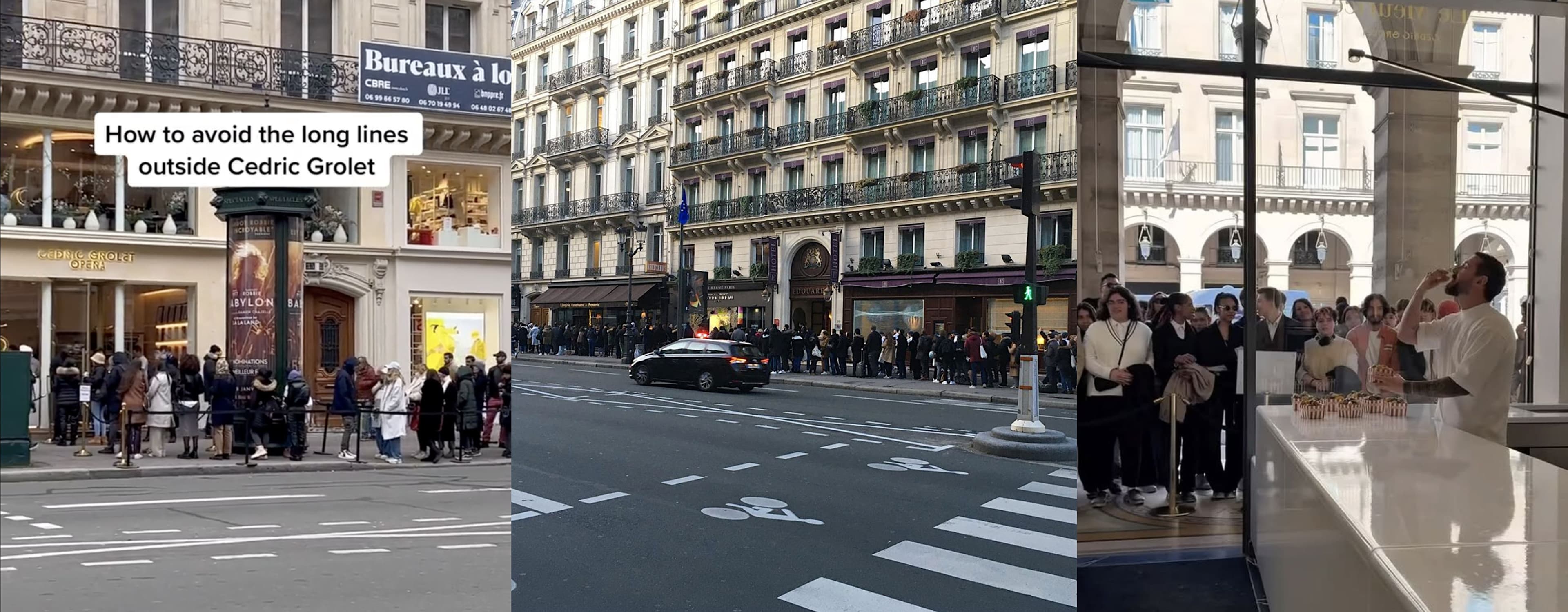 Images of the lines outside of famous pastry chef Credric Grolet's café, where people travel specifically to his Paris location just to see him make his creations and to try some for themselves (credits: tiktok.com/@thelittlebasketco / foodandsens.com / instagram.com/cedricgrolet)