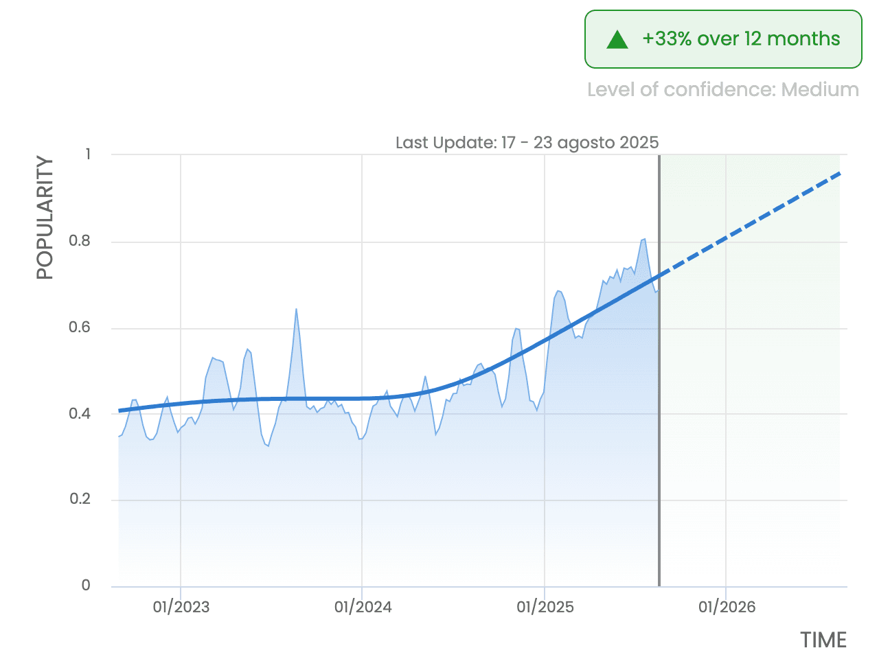The timeline that illustrates the popularity of the "Unapologetic Presence" in the posts of our insider community and its predicted growth of 33% over 12 months (screenshot taken from the Nextatlas platform in September 2025)