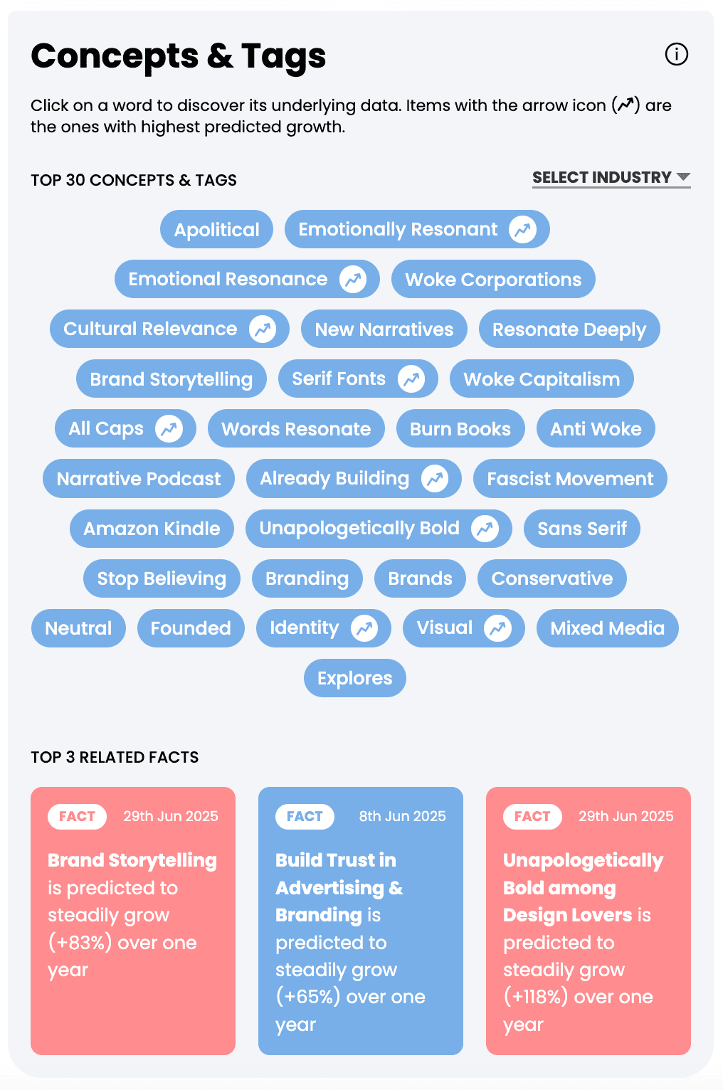 The top concepts, tags, and facts from our early adopter conversations in the "Unapologetic Presence" trend (screenshot taken from the Nextatlas platform in September 2025)