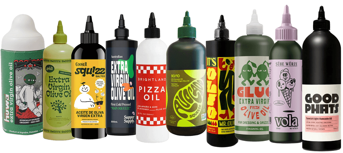 A few examples of new brands that have launched squeeze bottle olive oil this year (Credits: Snaxshots by Andrea Hernández on Substack)