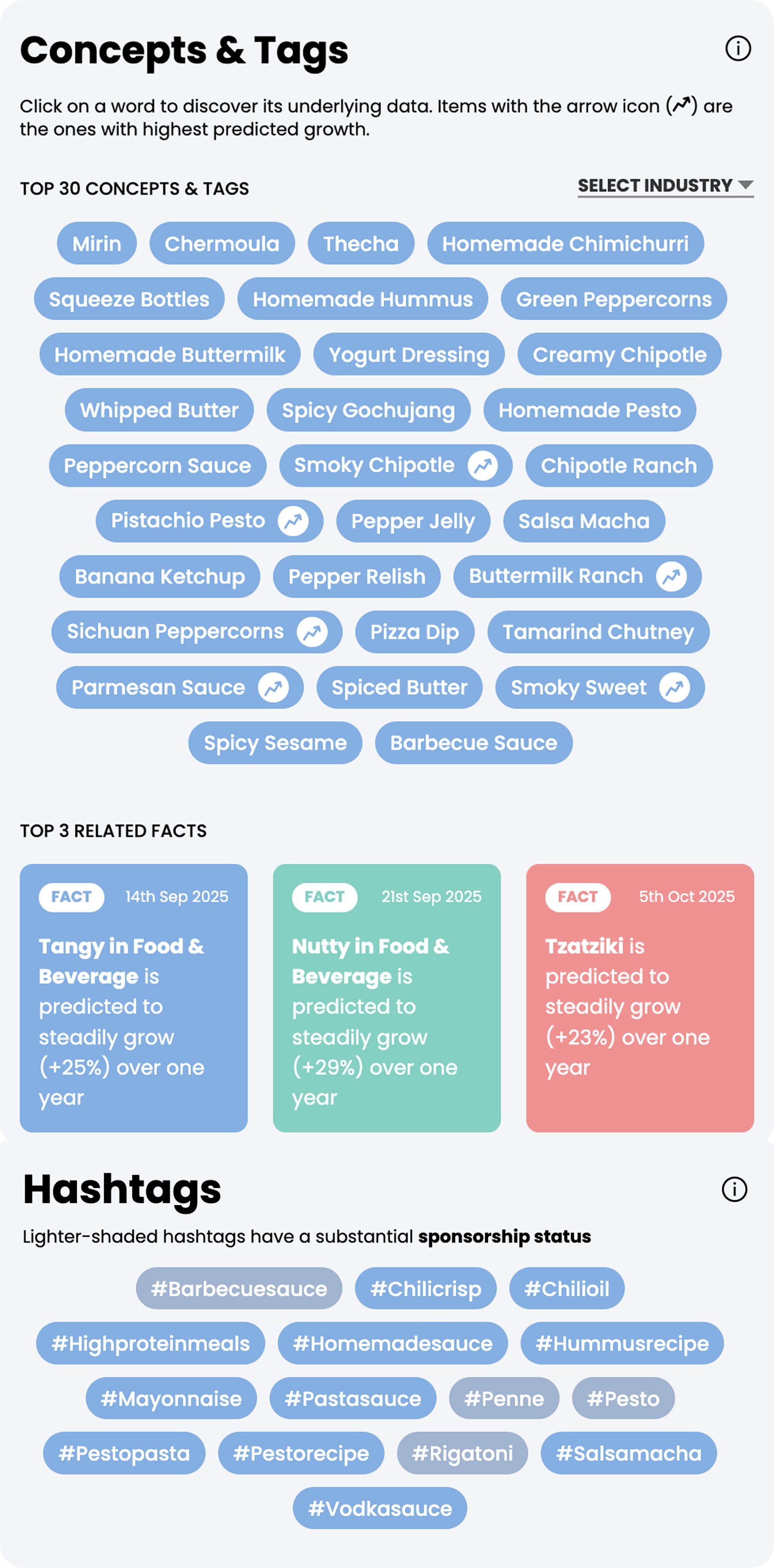 The top concepts, tags, facts, and hashtags from our early adopter conversations in the "Sauce Supremacy" trend (screenshot taken from the Nextatlas platform in October 2025)