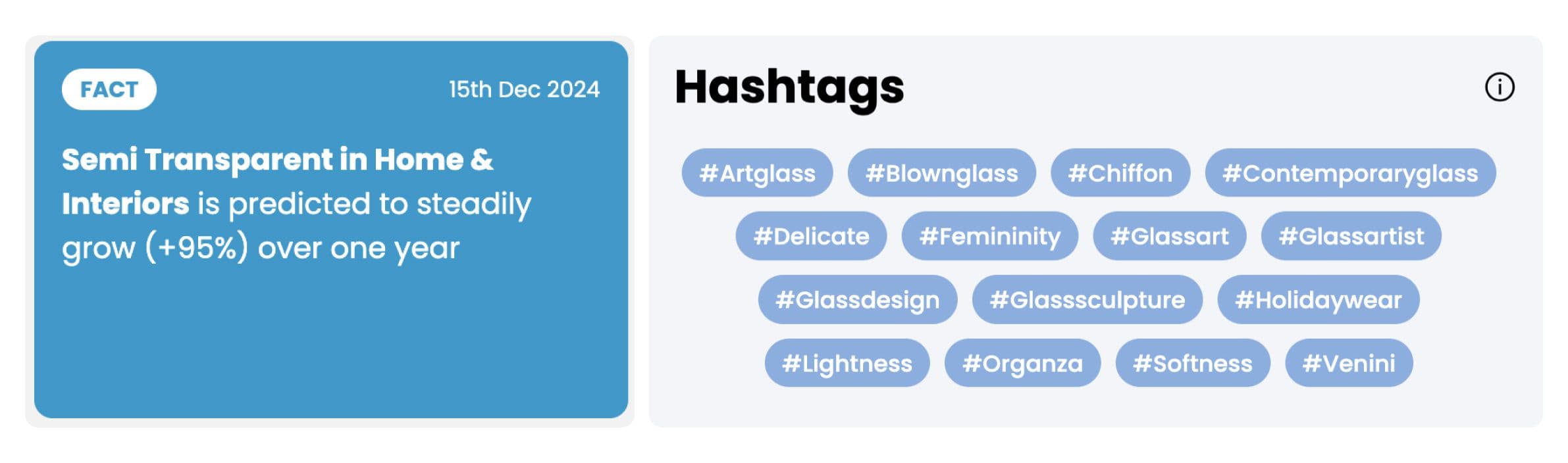 A relevant fact and all hashtags from our early adopter conversations from the "Sheer Beauty" trend on the Nextatlas platform (screenshot taken in March 2025)