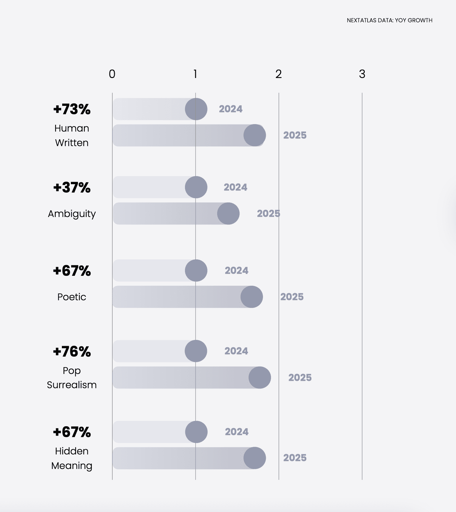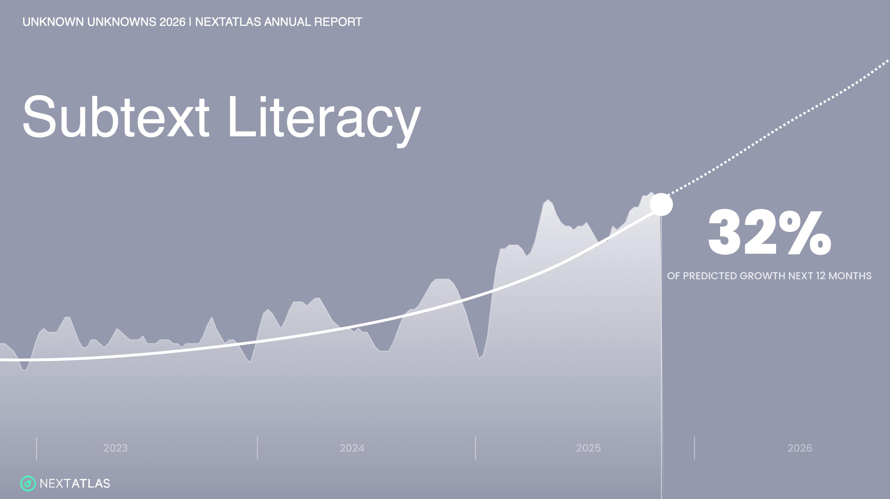 Nextatlas Data: year-over-year growth of relevant keywords related to the trend "Subtext Literacy" that proves the cultural shift