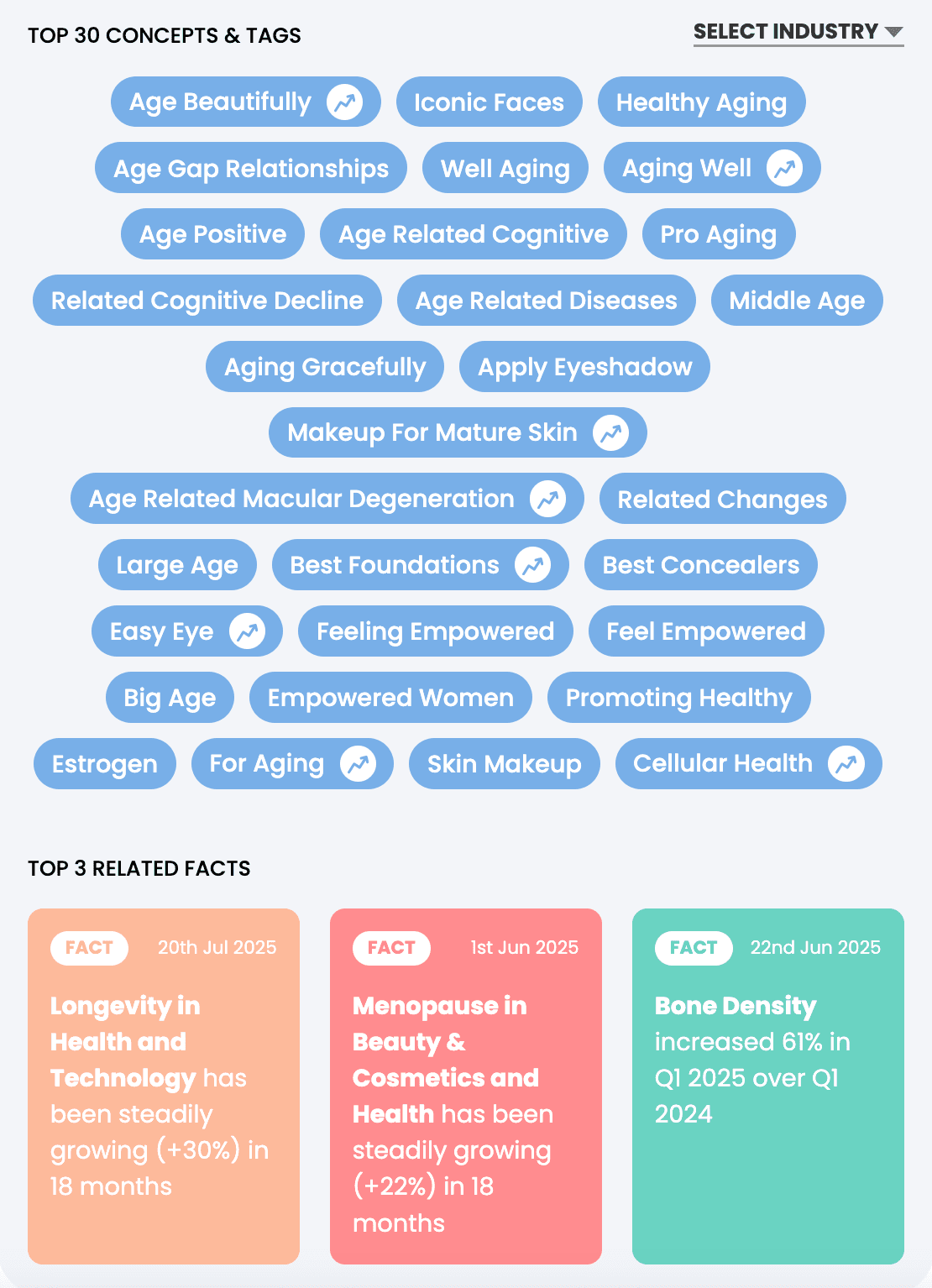 The top concepts, tags, and facts from our early adopter conversations in the "Midlife Revolution" trend (screenshot taken from the Nextatlas platform in July 2025)